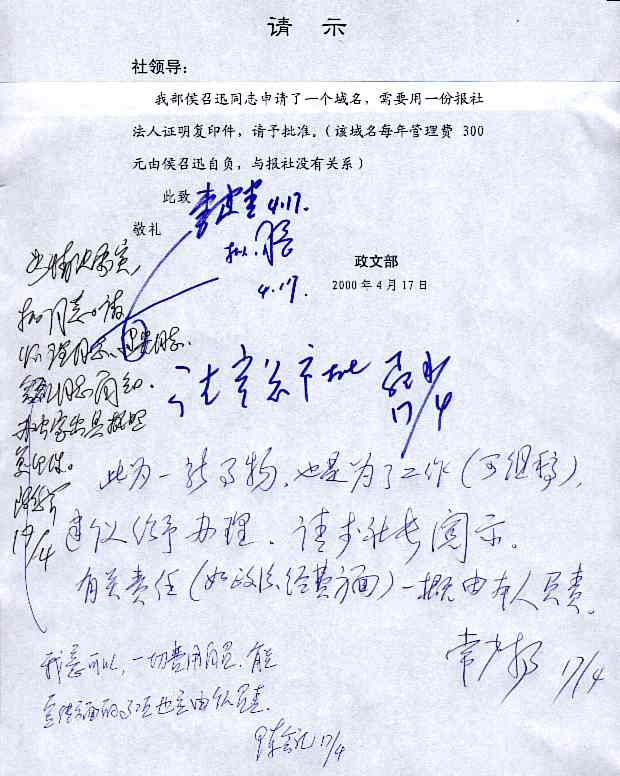 2000年4月,我覺得域名是個好東西,想去注冊,需要單位批準,部門領(lǐng)導(dǎo)和社領(lǐng)導(dǎo)開放開明,理解并支持。當然最后也沒用著報社的執(zhí)照,因為未注冊.cn而注冊了.com,后者不需要單位證明。當時可以申請三個字母的域名,比如i18、u18,最后我還是選了we18.com,“18”是“要法”“十八歲”。第二年,又申請了we01.com和we01.net。這三個頂級國際域名一直續(xù)費持有至今。