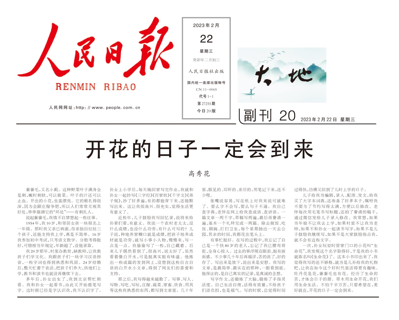 2023年2月22日,《人民日報(bào)》刊發(fā)我母親的文章《開花的日子一定會(huì)到來》。
