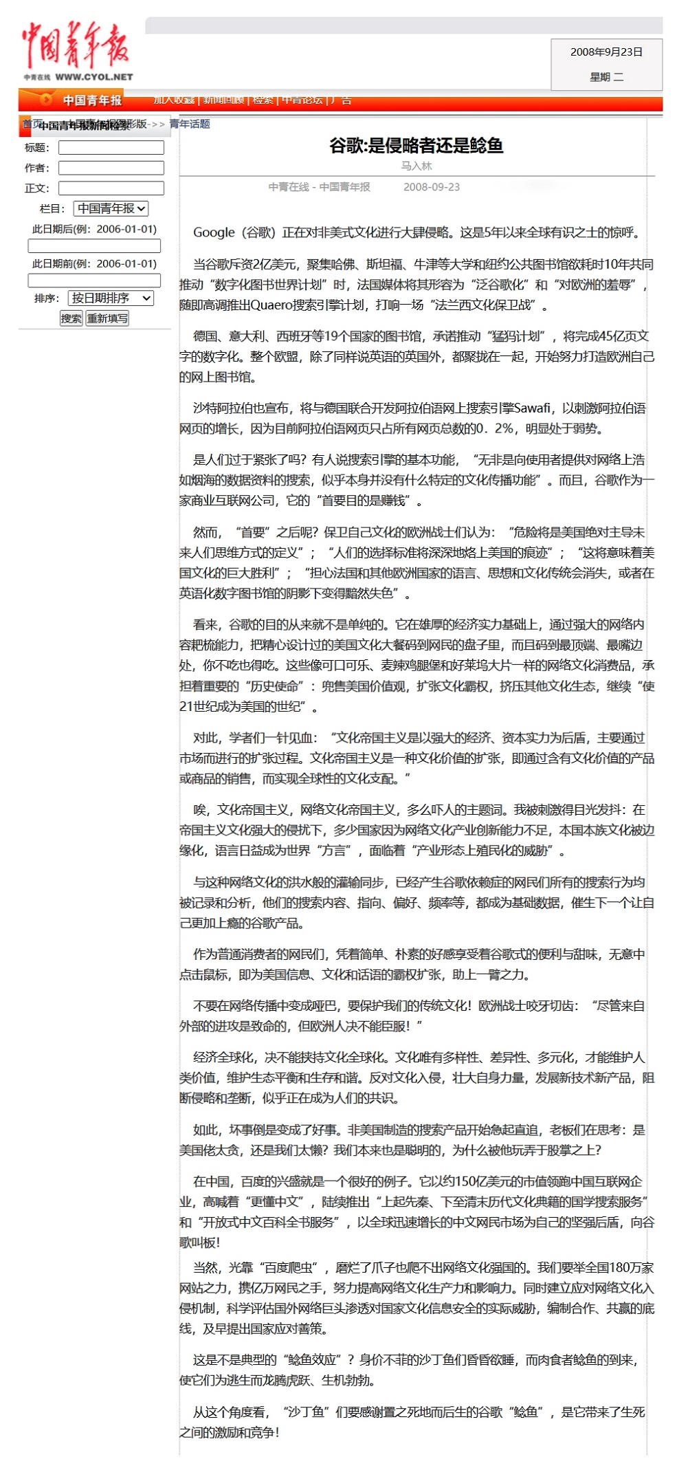 2008年9月23日,《中國青年報(bào)》“青年話題”專欄刊發(fā)《谷歌:是侵略者還是鯰魚》。