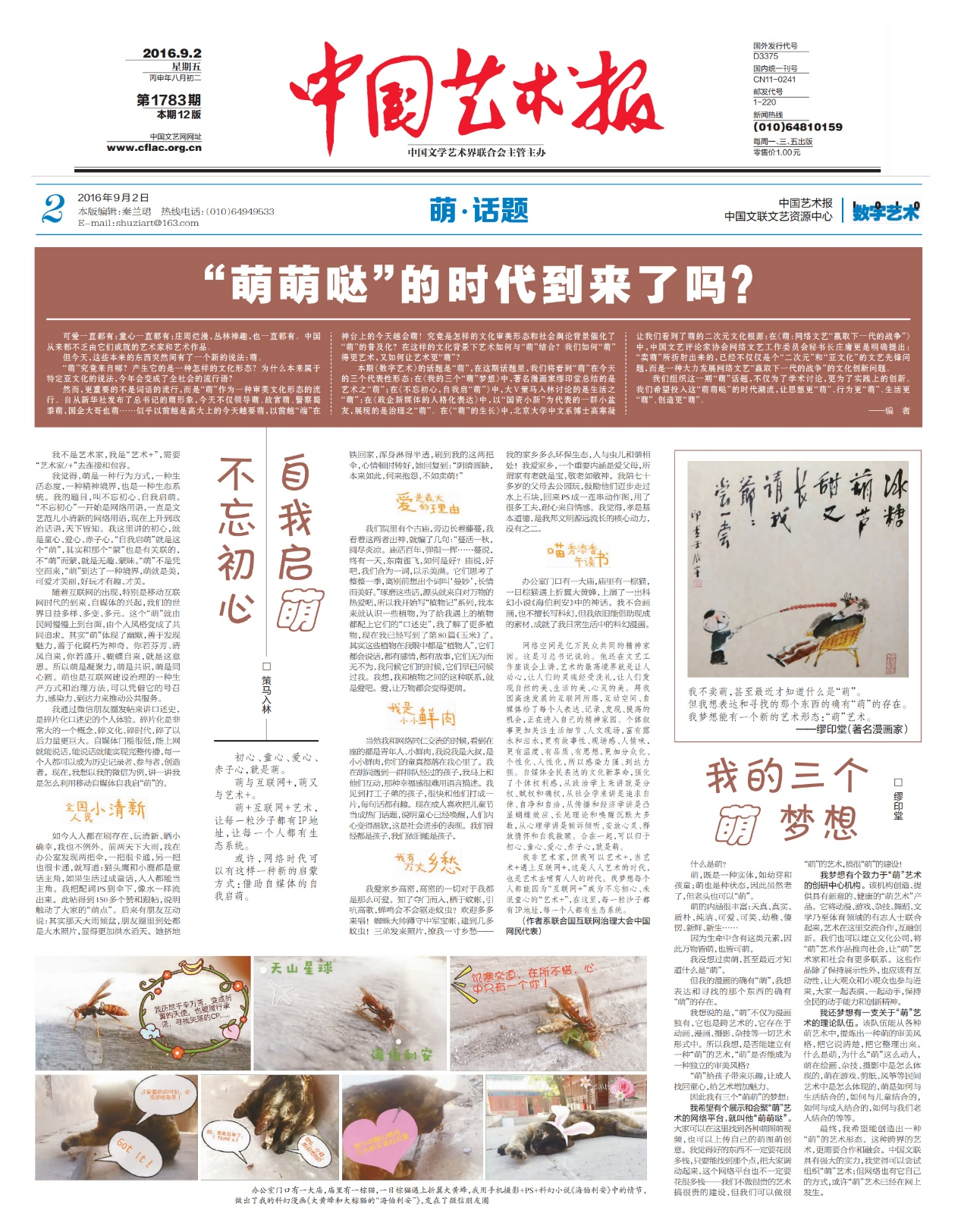 2016年8月6日,參加中國文聯(lián)文藝資源中心主題為“藝術(shù)的賣萌”的第二期藝術(shù)沙龍,發(fā)言并撰文《不忘初心 自我啟萌》,刊于9月2日《中國藝術(shù)報(bào)》。文章提出:我覺得,“萌”是一種行為方式,一種生活態(tài)度,一種精神境界,也是一種生態(tài)系統(tǒng)。我這里講的初心,就是童心、愛心、赤子心?!白晕覇⒚取本褪沁@個(gè)“萌”,其實(shí)和那個(gè)“蒙”也是有關(guān)聯(lián)的,不“萌”而蒙,就是無趣、蒙昧。“萌”不是憑空而來,“萌”到達(dá)了一種境界,萌就是美,可愛才美麗,好玩才有趣、才美。隨著互聯(lián)網(wǎng)的出現(xiàn),特別是移動(dòng)互聯(lián)網(wǎng)時(shí)代的到來、自媒體的興起,我們的世界日益多樣、多變、多元。這個(gè)“萌”就由民間慢慢上到臺面,由個(gè)人風(fēng)格變成了共同追求。其實(shí)“萌”體現(xiàn)了幽默,善于發(fā)現(xiàn)魅力,善于化腐朽為神奇。你若芬芳、清風(fēng)自來,你若盛開、蝴蝶自來。所以萌是凝聚力,萌是共識,萌是同心圓。萌也是互聯(lián)網(wǎng)建設(shè)治理的一種生產(chǎn)方式和治理方法,可以憑借它的號召力、感染力、到達(dá)力來推動(dòng)公共服務(wù)??倳浽谖乃嚬ぷ髯剷?huì)上指出,藝術(shù)的最高境界就是讓人動(dòng)心,讓人們的靈魂經(jīng)受洗禮,讓人們發(fā)現(xiàn)自然的美、生活的美、心靈的美。拜我國高速發(fā)展的互聯(lián)網(wǎng)所賜,互動(dòng)空間、自媒體給了每個(gè)人表達(dá)、記錄、發(fā)現(xiàn)、提高的機(jī)會(huì),正在進(jìn)入自己的精神家園。個(gè)體敘事更加關(guān)注生活細(xì)節(jié)、人文現(xiàn)場,富有露水和淚水,更有故事性、現(xiàn)場感、人情味, 更有溫度、有品質(zhì)、有思想,更加分眾化、個(gè)性化、人性化,所以感染力強(qiáng)、到達(dá)力強(qiáng)。自媒體全民表達(dá)的文化新革命,強(qiáng)化了個(gè)體權(quán)利感,就是分權(quán)、賦權(quán)和確權(quán),就是追求自律、自凈和自洽,就是凸顯蝴蝶效應(yīng)、長尾理論和喚醒沉默大多數(shù),就是傾訴傾聽、安放心靈、釋放情懷和自我救贖。合在一起,可以歸于初心、童心、愛心、赤子心,就是萌。我非藝術(shù)家,但我可以“藝術(shù)+”,當(dāng)“藝術(shù)+”遇上“互聯(lián)網(wǎng)+”,這便是人人藝術(shù)的時(shí)代,也是藝術(shù)去哺育人人的時(shí)代。我夢想每個(gè)人都能因?yàn)椤盎ヂ?lián)網(wǎng)+”成為不忘初心、未泯童心的“藝術(shù)+”,在這里,每一粒沙子都有IP地址,每一個(gè)人都有生態(tài)系統(tǒng)。