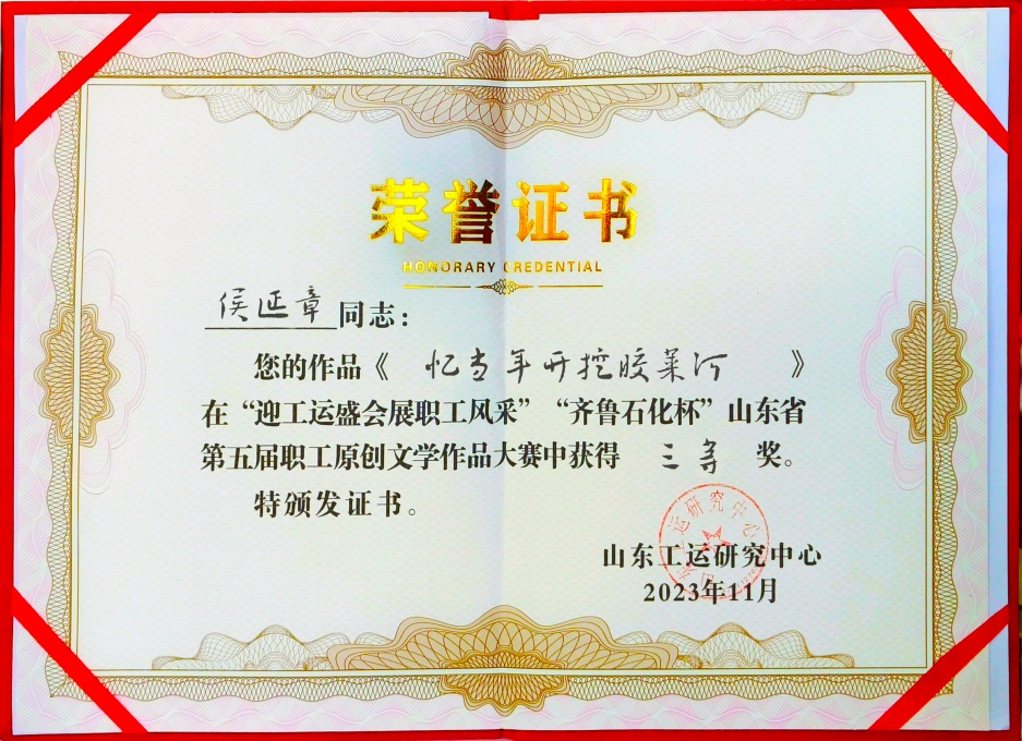 2023年11月,我父親的作品獲得山東工運(yùn)研究中心(《山東工人報(bào)》)征文三等獎(jiǎng)。