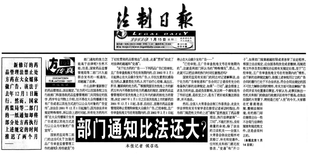 2001年修訂的藥品管理法禁止處方藥在大眾媒體做廣告,然而國家藥監(jiān)局、國家工商總局下發(fā)《關(guān)于加強藥品廣告審查監(jiān)督管理工作的通知》卻將部分處方藥執(zhí)行上述規(guī)定的時間推遲了兩個月或更久。針對這個情況,我采寫批評報道《部門通知比法還大?》,刊于2002年1月15日《法制日報》一版。報道指出,作為部門規(guī)范性文件的上述“通知”顯然違反了藥品管理法。除了該法的立法機關(guān)——全國人大常委會依法定程序?qū)ζ湫抻?、補充和完善外,任何機關(guān)和部門都無權(quán)修改、“變通”和“開口子”。此事反映出一些機關(guān)和部門的依法行政意識和水平、乃至最基本的法律意識,都還滯留在一個不高的層面。在依法治國大背景下、特別是已經(jīng)“入世”的今天,有的部門卻在繼續(xù)出臺一些不合現(xiàn)行法律的規(guī)章和規(guī)范性文件,是亟需糾正的。報道反響較大,1月17日,我繼續(xù)作跟蹤報道《豈能非法變通或“架空”法律》,全國人大常委會法工委、國務(wù)院法制辦有關(guān)負責(zé)人和參加過藥品管理法最初起草的老專家和黑龍江讀者提出,一些法律在實施中有時被部門的規(guī)章或規(guī)范性文件“架空”,一個行政部門就這樣把法律實施時間說推遲就推遲是不合法的,不能因為遷就一些實際困難而犧牲法律的權(quán)威性和嚴肅性。報道在一定程度上“揭開了蓋子”“敲開了冰山一角”。
