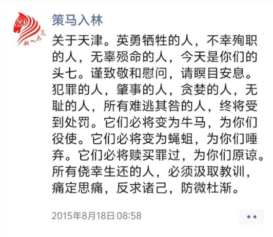 以上三帖,分別為天津8·12濱海新區(qū)爆炸事故“頭七”、山東平度平邑發(fā)生傷民案件、聲援鐵肩擔(dān)道義記者等所發(fā)。多年來,一些案事件頻頻發(fā)生,源于當事地方或部門瀆職不作為或濫權(quán)亂作為,造成嚴重后果,令人觸目驚心。正氣感召,責(zé)無旁貸,匕首投槍,敢于斗爭。