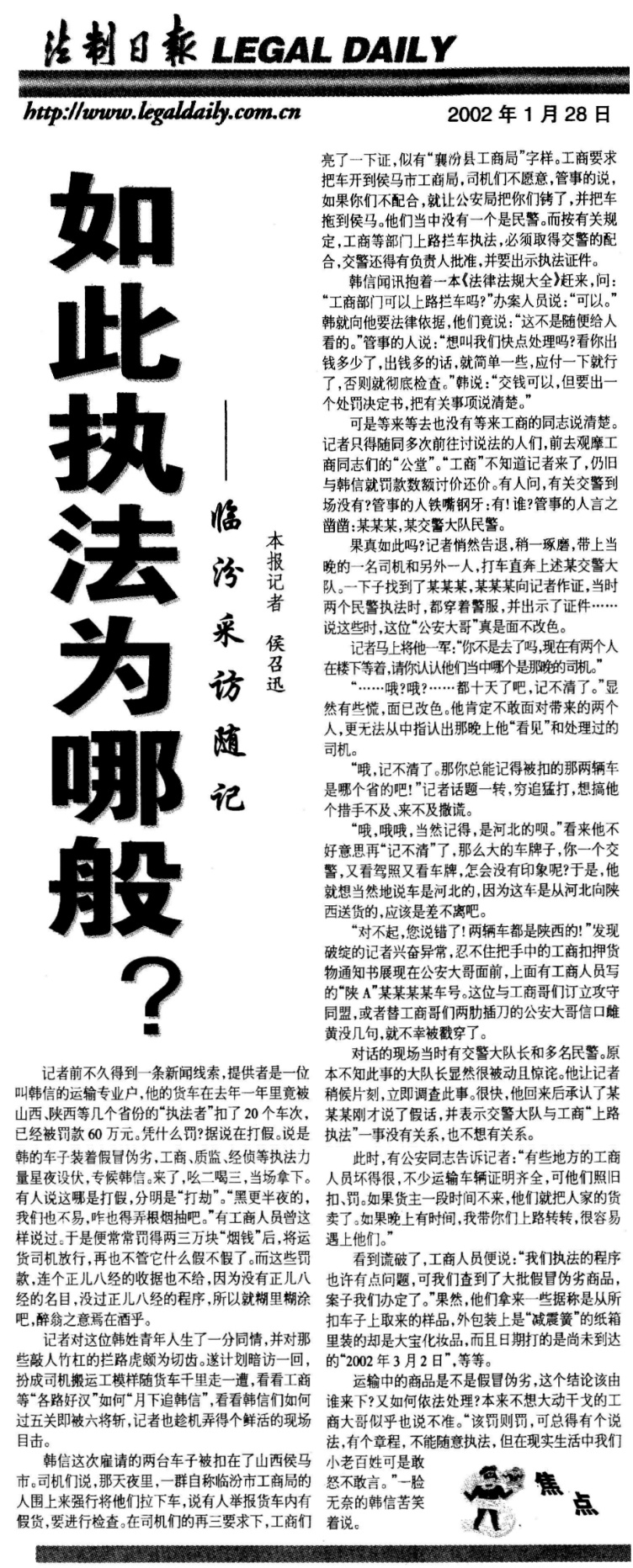 2002年初,針對山西公路“三亂(亂設(shè)卡、亂收費、亂罰款)”之頑瘴痼疾,我根據(jù)一條新聞線索,隨運輸業(yè)戶韓信千里赴晉進行暗訪。在山西臨汾,分別到工商管理和交警部門暗訪,現(xiàn)場目睹所謂辦案人員拒絕出示執(zhí)法依據(jù)、明目張膽要錢放行,當場戳穿了兩家單位人員合伙編造的謊言,對其濫用職權(quán)亂作為的違法行為予以批評。相關(guān)報道《如此執(zhí)法為哪般》刊于2002年1月28日《法制日報》。