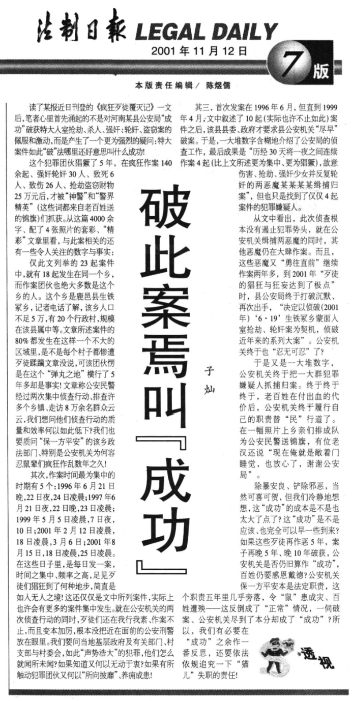2001年11月12日,《法制日報》刊發(fā)《破此案焉叫“成功”》。