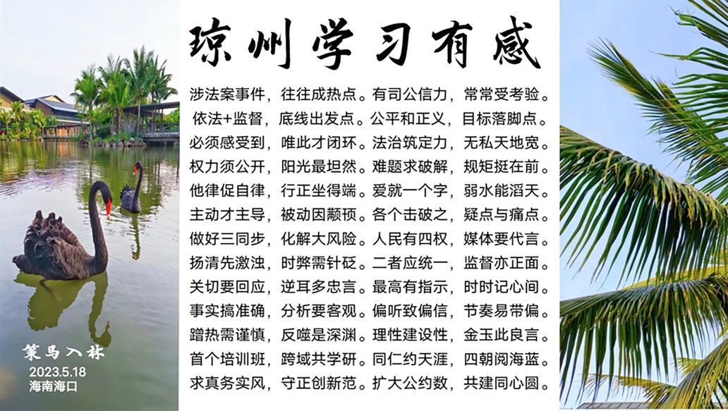 2020年9月22日,參加中央網(wǎng)信辦、中央政法委指導(dǎo)的“大國小鮮 基層之治”網(wǎng)絡(luò)主題宣傳活動(dòng),發(fā)言提出:社會(huì)治理就是“烹小鮮”,這個(gè)看起來很大的題目,核心還是人,每一個(gè)人的合理需求和合法權(quán)益都是社會(huì)治理服務(wù)的對(duì)象。依法維護(hù)廣大人民群眾和一家一戶一人的合法權(quán)益,才能真正維護(hù)和諧安定的社會(huì)秩序。守護(hù)好萬家燈火就是我們工作和服務(wù)的內(nèi)涵,用繡花針工夫做好社會(huì)治理大文章。媒體通過作品的傳播力、影響力、公信力,真實(shí)還原治理一線“烹小鮮”行為,生動(dòng)呈現(xiàn)基層守正創(chuàng)新、擔(dān)當(dāng)作為的故事細(xì)節(jié),同時(shí)以共情力和同情心洞察百姓期待與訴求。