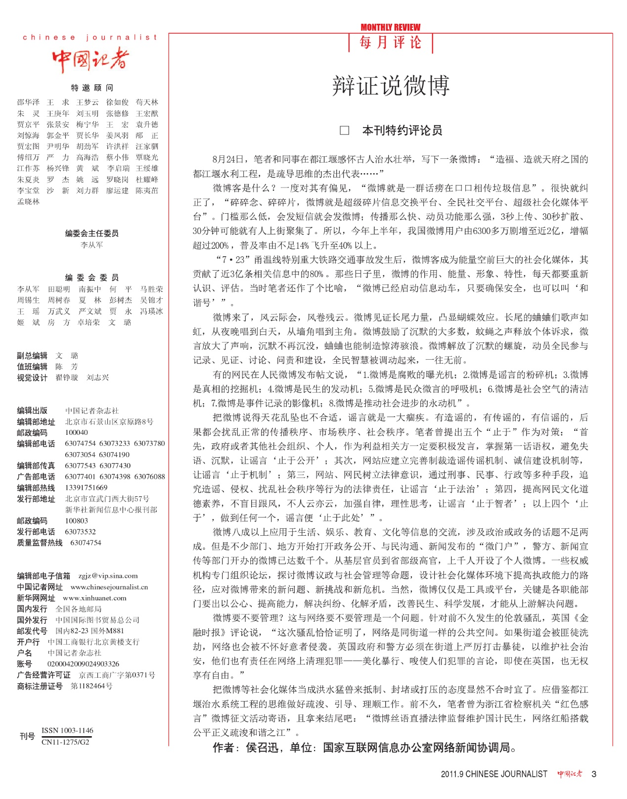 《中國記者》2011年第9期“每月評(píng)論”刊發(fā)《辯證說微博》。