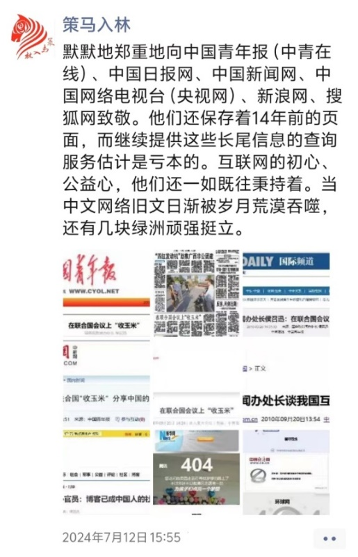 2024年7月3日,我發(fā)了一條朋友圈:前些天看到有人說網(wǎng)絡(luò)“崩塌”,有點(diǎn)著慌,馬上去找以前寫的一些帖文,真發(fā)現(xiàn)了問題。多年前可以搜到數(shù)千上萬條自己寫的稿子或與己有關(guān)的信息,現(xiàn)在去重、有用的所剩不多,還被一些收費(fèi)網(wǎng)站囤去一些,不交錢不讓看。QQ空間日志(騰訊博客)的一千多篇還在,互動(dòng)也在,鏈接卻多成死鏈。新浪博客的一千多篇也在,互動(dòng)沒了,考慮到博主需要,設(shè)置了備份按鈕,確實(shí)負(fù)責(zé)任。早已停服的博客中國,竟然還能打開。鏈接的新聞網(wǎng)頁還在的,有新浪網(wǎng)、中國青年報(bào)中青在線、中國日?qǐng)?bào)網(wǎng)、中國新聞網(wǎng)、央視網(wǎng)、搜狐網(wǎng)等。包括人民網(wǎng)、新華網(wǎng)、中國網(wǎng)、國際在線、央廣網(wǎng)等大多數(shù)新聞網(wǎng)站及騰訊新聞、網(wǎng)易新聞、鳳凰新聞等,已經(jīng)404或403,而我最多的鏈接是人民網(wǎng)的,真是遺憾。對(duì)低效益的冷寂長尾內(nèi)容,很多網(wǎng)站平臺(tái)不愿再運(yùn)營維護(hù),便卸載斷服。“互聯(lián)網(wǎng)是有記憶的”,這話需要加以限定了,十年記憶就不容易,“永久”“免費(fèi)”已是傳說。接下來,有用的盡快備份吧,不管微博微信短視頻啥的,來有影去無蹤,或終將煙消云散南柯夢(mèng)。值得敬佩的是一些良心平臺(tái),尚能以公益為重,秉持初心,堅(jiān)持至今,繼續(xù)提供信息服務(wù),不容易不簡單。