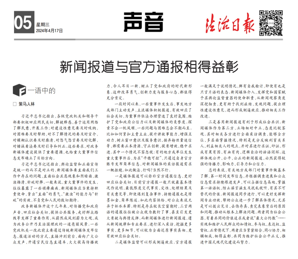 《新聞報(bào)道與官方通報(bào)相得益彰》法治日?qǐng)?bào) 中國記協(xié) 2024-04-17