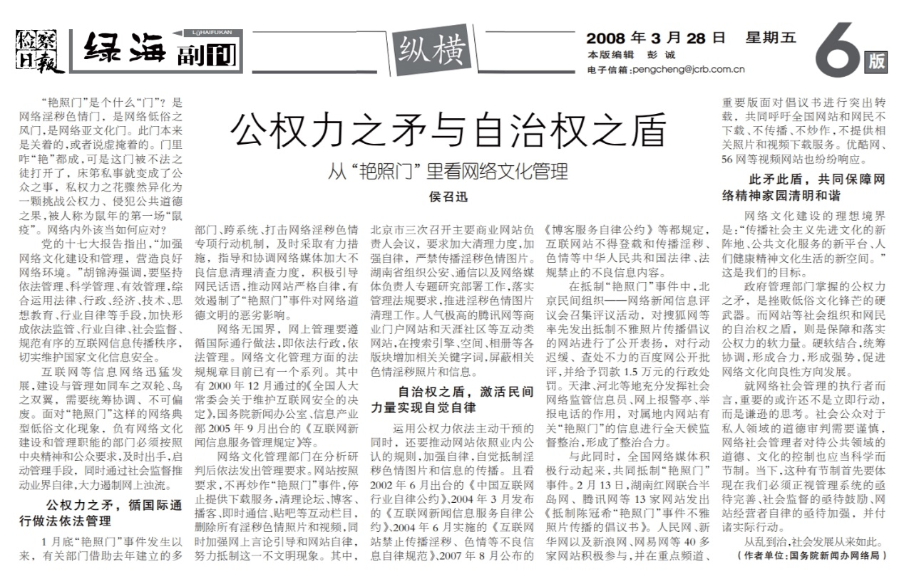 針對(duì)“艷照門”等網(wǎng)絡(luò)低俗文化現(xiàn)象的治理,撰寫《公權(quán)力之矛與自治權(quán)之盾——從“艷照門”里看網(wǎng)絡(luò)文化管理》,刊于2008年3月28日《檢察日?qǐng)?bào)》。文章提出,負(fù)有網(wǎng)絡(luò)文化建設(shè)和管理職能的部門要遵循國際通行做法,依法行政,依法管理,及時(shí)出手,啟動(dòng)管理手段。運(yùn)用公權(quán)力依法主動(dòng)干預(yù)的同時(shí),還要推動(dòng)網(wǎng)站依照業(yè)內(nèi)公認(rèn)的規(guī)則,加強(qiáng)自律,自覺抵制淫穢色情圖片和信息的傳播。政府管理部門掌握的公權(quán)力之矛,是挫敗低俗文化鋒芒的硬武器。而網(wǎng)站等社會(huì)組織和網(wǎng)民的自治權(quán)之盾,則是保障和落實(shí)公權(quán)力的軟力量。硬軟結(jié)合,統(tǒng)籌協(xié)調(diào),形成合力,促進(jìn)網(wǎng)絡(luò)文化良性發(fā)展。就網(wǎng)絡(luò)社會(huì)管理的執(zhí)行者而言,非常重要的一點(diǎn)是謙遜的思考。社會(huì)公眾對(duì)于私人領(lǐng)域的道德審判需要謹(jǐn)慎,網(wǎng)絡(luò)社會(huì)管理者對(duì)待公共領(lǐng)域的管控也應(yīng)當(dāng)科學(xué)而節(jié)制。當(dāng)下,管理系統(tǒng)亟待完善,社會(huì)監(jiān)督亟待鼓勵(lì),網(wǎng)站經(jīng)營者自律亟待加強(qiáng)。