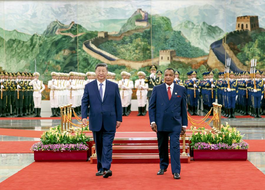 9月6日上午,國家主席習(xí)近平在北京人民大會(huì)堂同來華出席中非合作論壇北京峰會(huì)并進(jìn)行國事訪問的剛果(布)總統(tǒng)薩蘇舉行會(huì)談。這是會(huì)談前,習(xí)近平在人民大會(huì)堂北大廳為薩蘇舉行歡迎儀式。