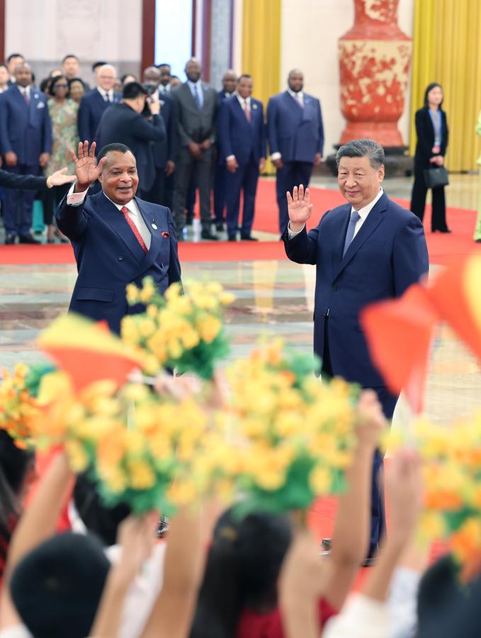 9月6日上午,國家主席習(xí)近平在北京人民大會(huì)堂同來華出席中非合作論壇北京峰會(huì)并進(jìn)行國事訪問的剛果(布)總統(tǒng)薩蘇舉行會(huì)談。