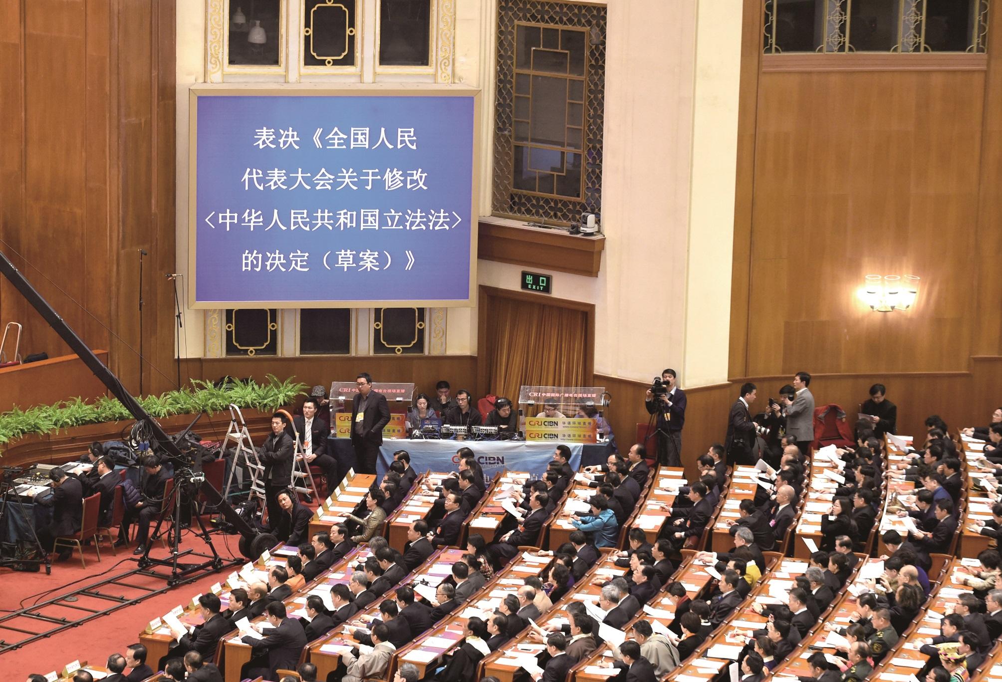 2015年3月15日,十二屆全國(guó)人大三次會(huì)議表決通過(guò)關(guān)于修改立法法的決定。 本報(bào)記者 楊晉峰 攝
