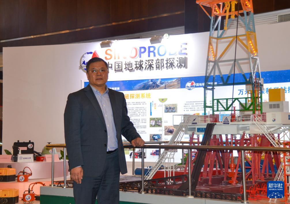 黃大年在中國地球深部探測項目年會上(2013年4月18日攝),身旁是他率領(lǐng)團(tuán)隊研發(fā)的“地殼一號”萬米大陸科學(xué)鉆探機(jī)的展示模型。 新華社發(fā)