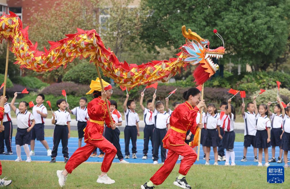 9月27日,學(xué)生在浙江省湖州市德清縣乾元鎮(zhèn)中心小學(xué)進(jìn)行舞龍表演。