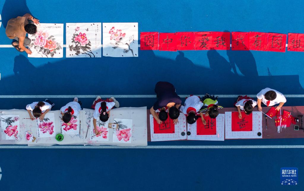 9月27日,在四川省眉山市彭山區(qū)鵬利小學(xué),學(xué)生通過書法和繪畫表達(dá)對(duì)祖國(guó)的祝福(無人機(jī)照片)。