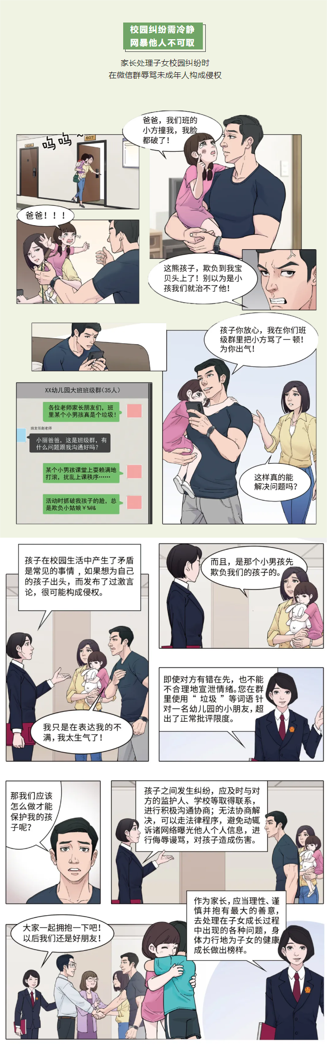 本案針對互聯(lián)網(wǎng)時(shí)代校園糾紛的線上化明確了行為邊界。兒童的身心尚未成熟,需要國家、家庭、學(xué)校、社會(huì)特殊的保護(hù)和照料。幼兒園是學(xué)齡前兒童除家庭之外最重要的生活學(xué)習(xí)場所,對于幼兒園同學(xué)之間產(chǎn)生的糾紛,家長應(yīng)在充分理解兒童成長規(guī)律和身心特點(diǎn)的基礎(chǔ)之上理性對待、謹(jǐn)慎處理,不能生硬地套用成年人的標(biāo)準(zhǔn)判斷、評價(jià)其行為動(dòng)機(jī)和邏輯,在充分了解事實(shí)的基礎(chǔ)上采取合理的溝通方式,避免因糾紛處理不當(dāng)對未成年人帶來次生傷害。