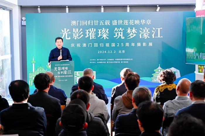 “光影璀璨 筑夢濠江——慶祝澳門回歸祖國25周年”攝影展12月2日在京開幕,圖為中國外文局歐亞中心(人民畫報社)主任姜永鋼發(fā)表致辭。 主辦方供圖