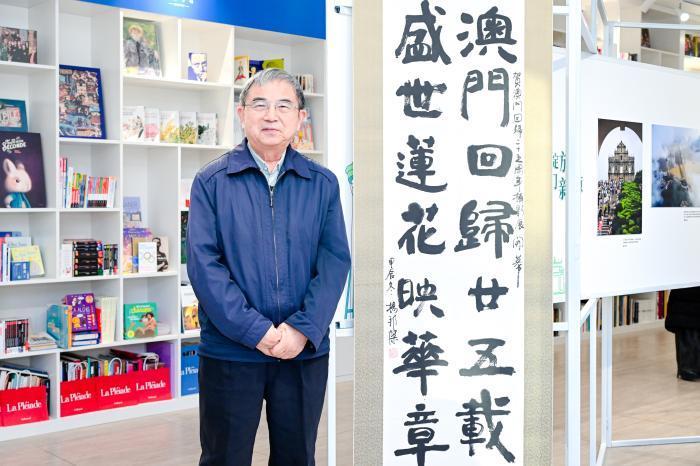 “澳門回歸廿五載,盛世蓮花映華章?!痹跀z影展板旁,懸掛著楊邦杰提的一幅書法作品,他告訴記者,澳門保留了過往古老的建筑、商業(yè)中心的特色,如今又擁有澳門科技大學(xué)、路氹金光大道、港珠澳大橋等現(xiàn)代景觀,感觸很深,希望以此表示對澳門回歸祖國25年來發(fā)展盛況的祝賀。