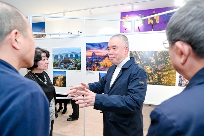 “光影璀璨 筑夢濠江——慶祝澳門回歸祖國25周年”攝影展12月2日在京開幕,圖為澳門科技大學(xué)副校長唐嘉樂介紹攝影展。 主辦方供圖