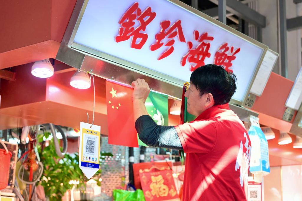 澳門紅街市的一家魚檔業(yè)主關(guān)偉銘在檔位上掛起嶄新的國旗區(qū)旗,還特意穿上喜慶的衣服?!傲?xí)主席的惦念,讓澳門人都非常感激。我寫了一副對聯(lián):‘盛世龍傳鏡海興,街市當(dāng)紅百業(yè)旺’,想告訴習(xí)主席,我們的日子越來越紅火?!彼f。