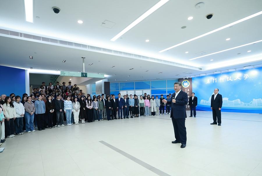 12月19日上午,國家主席習(xí)近平在澳門特別行政區(qū)行政長官賀一誠陪同下,來到澳門科技大學(xué)考察,同學(xué)校師生和科研工作者親切交流。這是習(xí)近平在學(xué)校圖書館大廳同科研人員、在校師生親切交流。