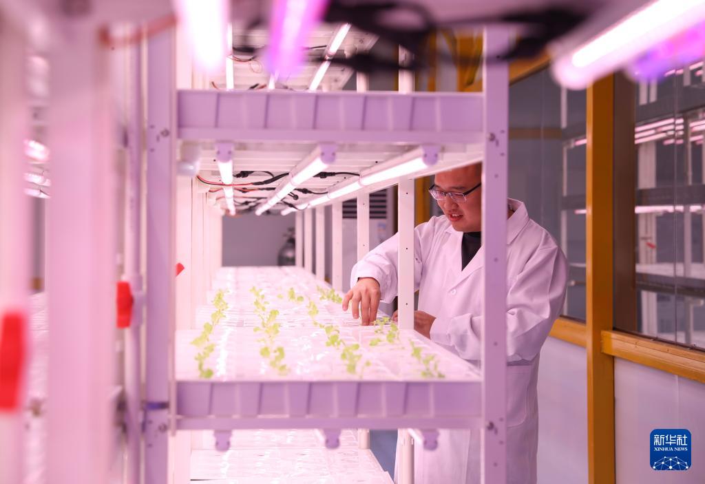 12月25日,在位于河南新鄉(xiāng)的中原農谷植物工廠,科研人員查看培育的生菜苗。
