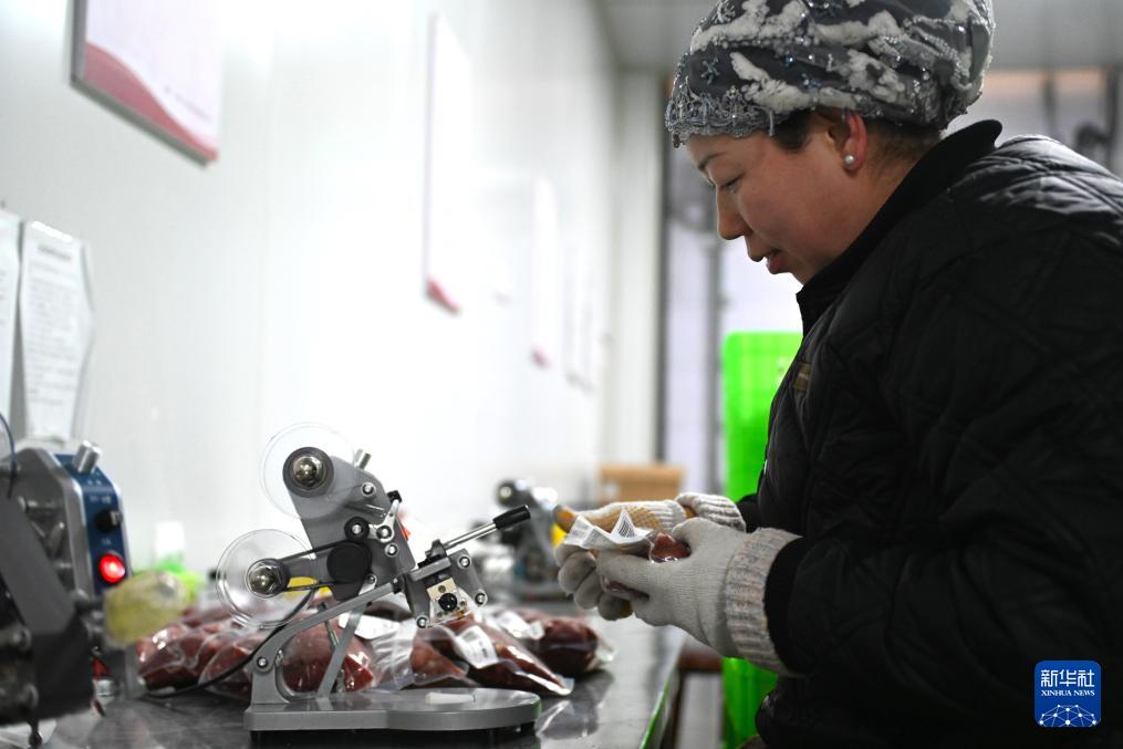 1月6日,工作人員在寧夏固原市涇源縣源牛農牧科技有限公司為黃牛肉產品貼標簽。