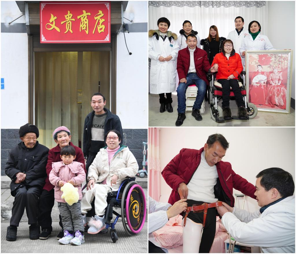 這是一張拼版照片。左圖為:2024年12月29日,牟文貴(后)、曹曉霞(右一)與家人在自家開(kāi)設(shè)的商店前合影(新華社記者張博文攝);右上圖為:2019年1月6日,新年剛拍完結(jié)婚照的牟文貴(前左)夫婦與他們的家庭醫(yī)生簽約服務(wù)團(tuán)隊(duì)合影(新華社記者邵瑞攝);右下圖為:2019年1月6日,家庭醫(yī)生團(tuán)隊(duì)的醫(yī)生在為右腿截肢的牟文貴(中)穿戴義肢(新華社記者邵瑞攝)。