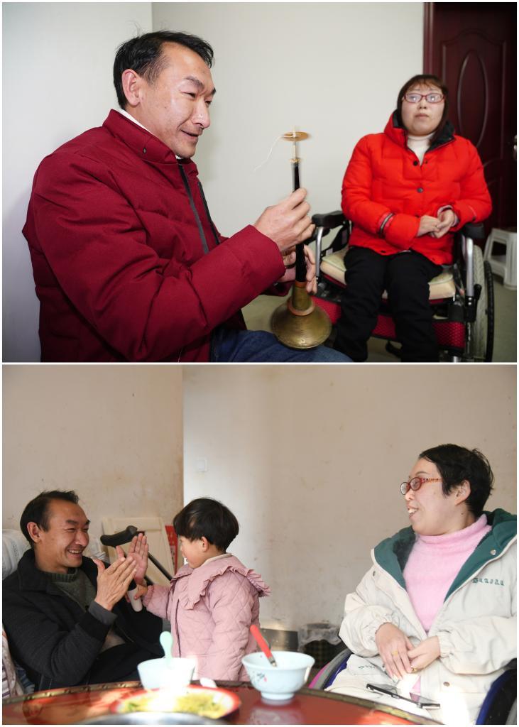 這是一張拼版照片,上圖為:2019年1月6日,牟文貴(左)在家為妻子吹奏嗩吶(新華社記者邵瑞攝);下圖為:2024年12月29日,牟文貴(左一)在家與女兒玩耍(新華社記者張博文攝)。