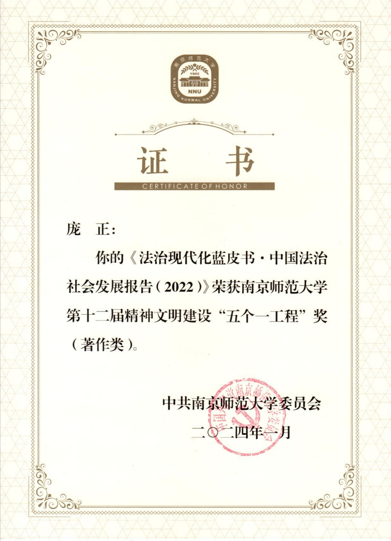 2024年1月,南京師范大學(xué)中國法治現(xiàn)代化研究院龐正研究員主持的《法治現(xiàn)代化藍皮書·中國法治社會發(fā)展報告2022》榮獲南京師范大學(xué)第十二屆精神文明建設(shè)“五個一工程”獎。