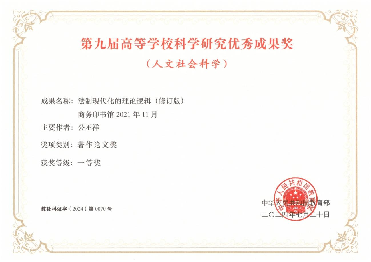 2024年7月,南京師范大學中國法治現(xiàn)代化研究院院長公丕祥的著作《法制現(xiàn)代化的理論邏輯(修訂版)》榮獲第九屆高等學??茖W研究優(yōu)秀成果獎(人文社會科學)一等獎。