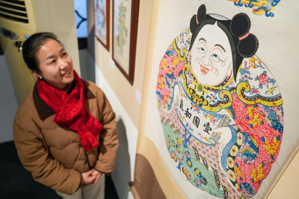 1月8日,喬蘭蓉在觀看桃花塢木版年畫作品《一團和氣》。新華社記者 李博 攝