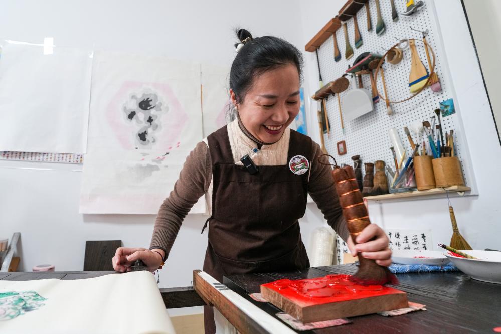 1月19日,游客在一團和氣館中體驗桃花塢木版年畫產(chǎn)品。新華社發(fā)