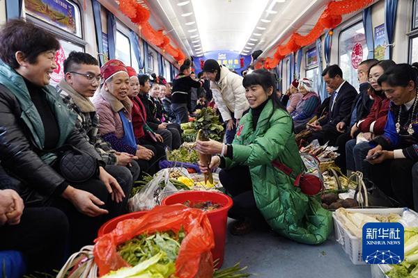 18日15點40分左右,在貴陽開往玉屏的5640/39次“村火車”上,由國鐵成都局貴陽客運段開設(shè)的“新春年貨鋪”連續(xù)第7年開張營業(yè)。