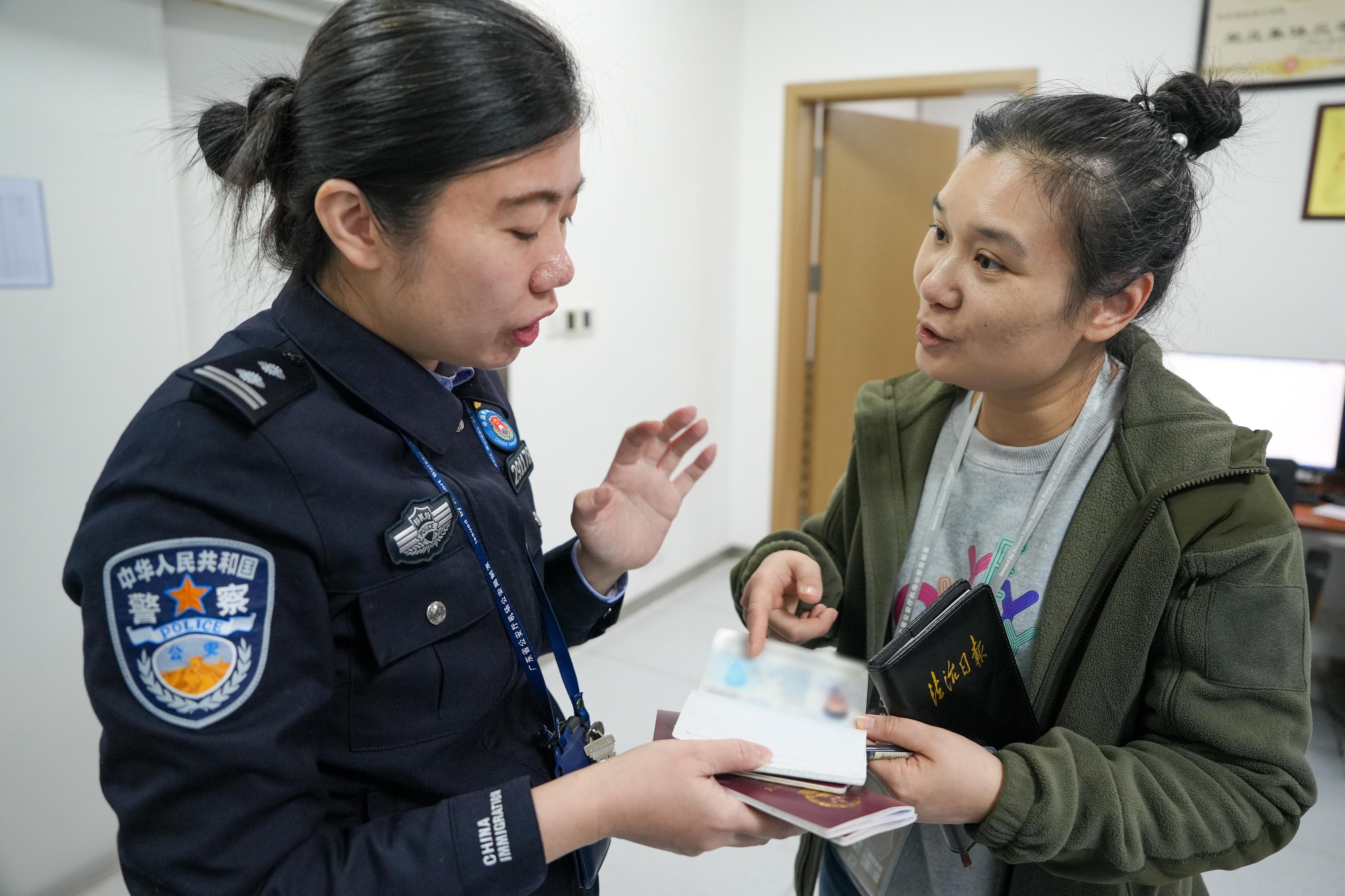 “新年好,不著急,慢慢來?!泵窬钤砌温曇魷睾停舆^護(hù)照后,她熟練地進(jìn)行人證對照、翻查護(hù)照、錄入信息、仔細(xì)核對……一氣呵成的流程結(jié)束,一枚驗(yàn)訖章穩(wěn)穩(wěn)地蓋下。
