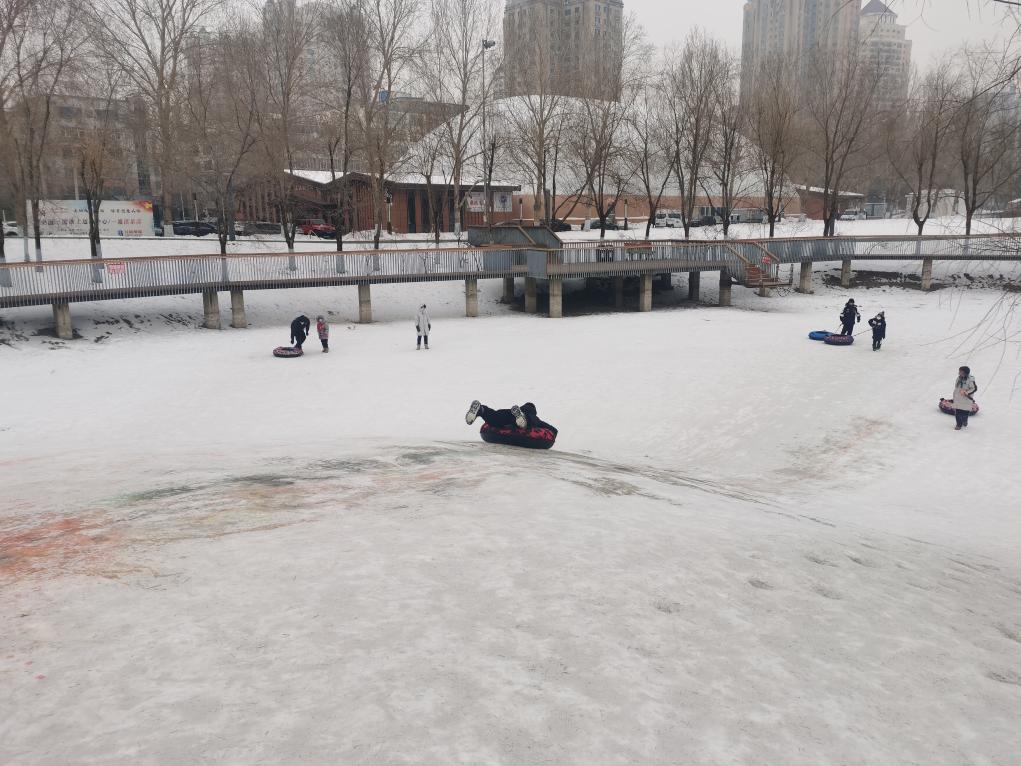 在哈爾濱湘江公園,28日一早,10歲的黃梓天就和爸爸一起來玩雪圈。這處公園里形成的自然雪坡,每年冬季都成為市民滑雪圈的好去處?!霸缟虾⒆右獊?,就帶著過來玩一會,也是一種過年的方式。”黃梓天的父親黃文說。
