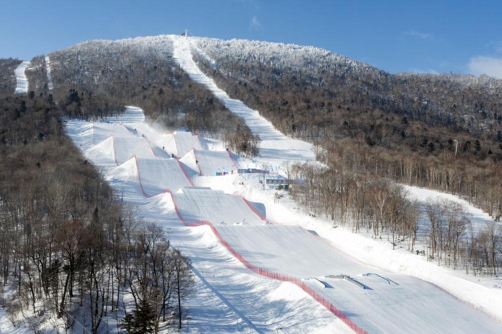 這是1月16日拍攝的位于亞布力滑雪場內的第九屆亞冬會坡面障礙技巧場地和大跳臺場地(無人機照片)。新華社記者 謝劍飛 攝