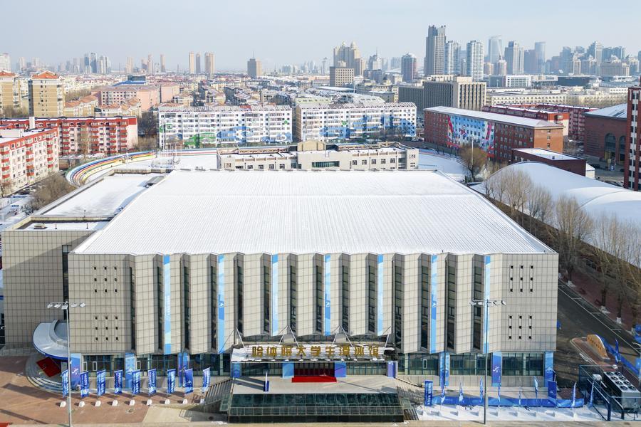 這是1月21日拍攝的哈爾濱體育學(xué)院大學(xué)生滑冰館(女子冰球比賽場(chǎng)館)(無(wú)人機(jī)照片)。新華社記者 王松 攝