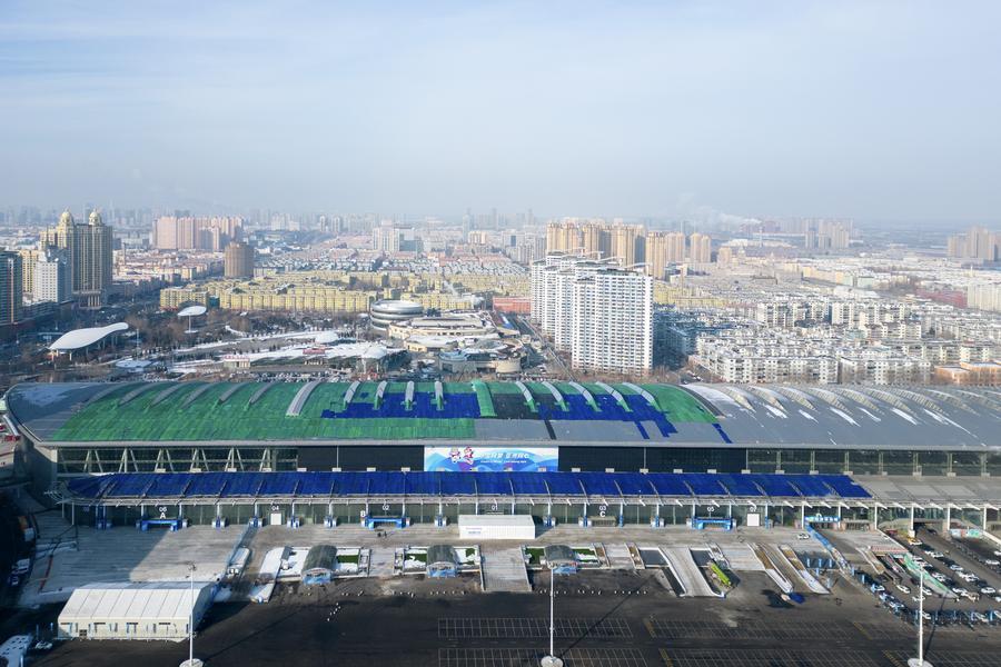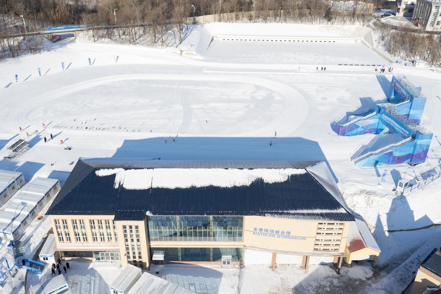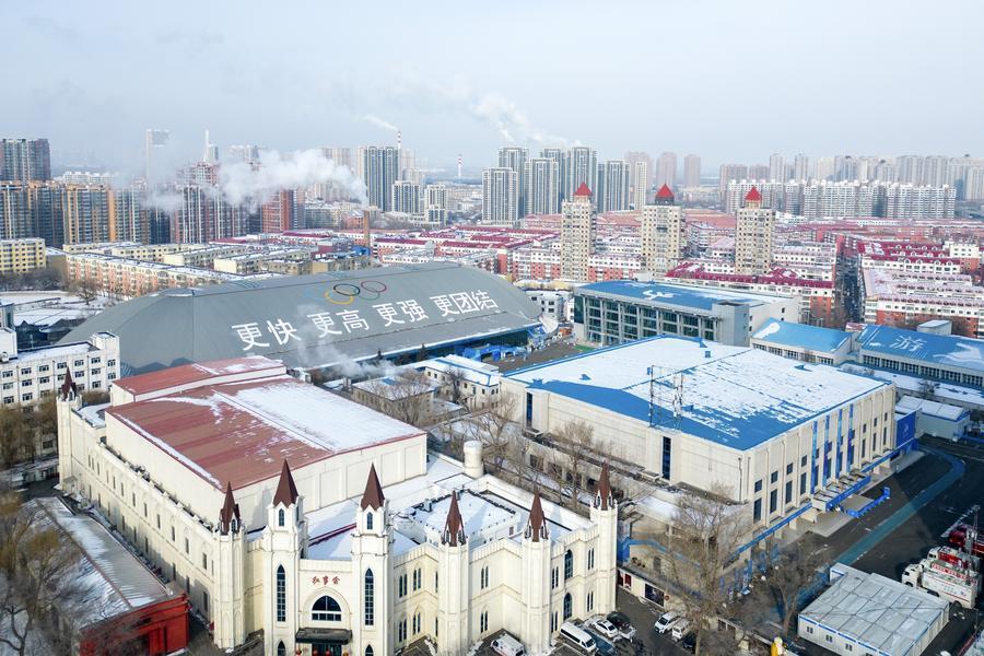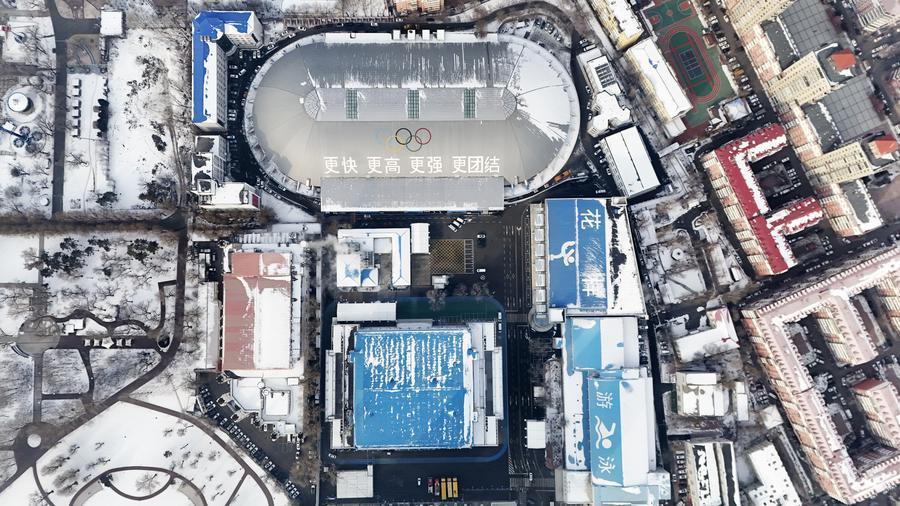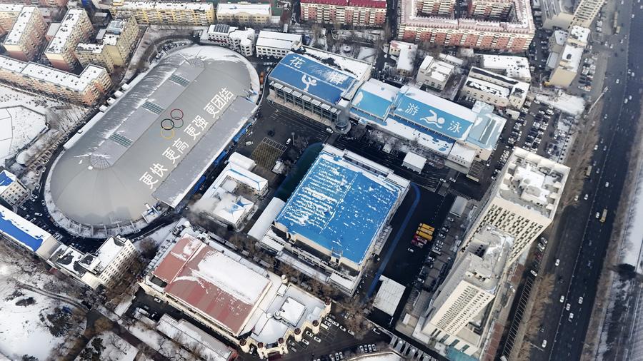 這是1月21日拍攝的黑龍江省冰上訓(xùn)練中心綜合館(短道速滑、花樣滑冰比賽場(chǎng)館)(無(wú)人機(jī)照片)。新華社記者 王松 攝
