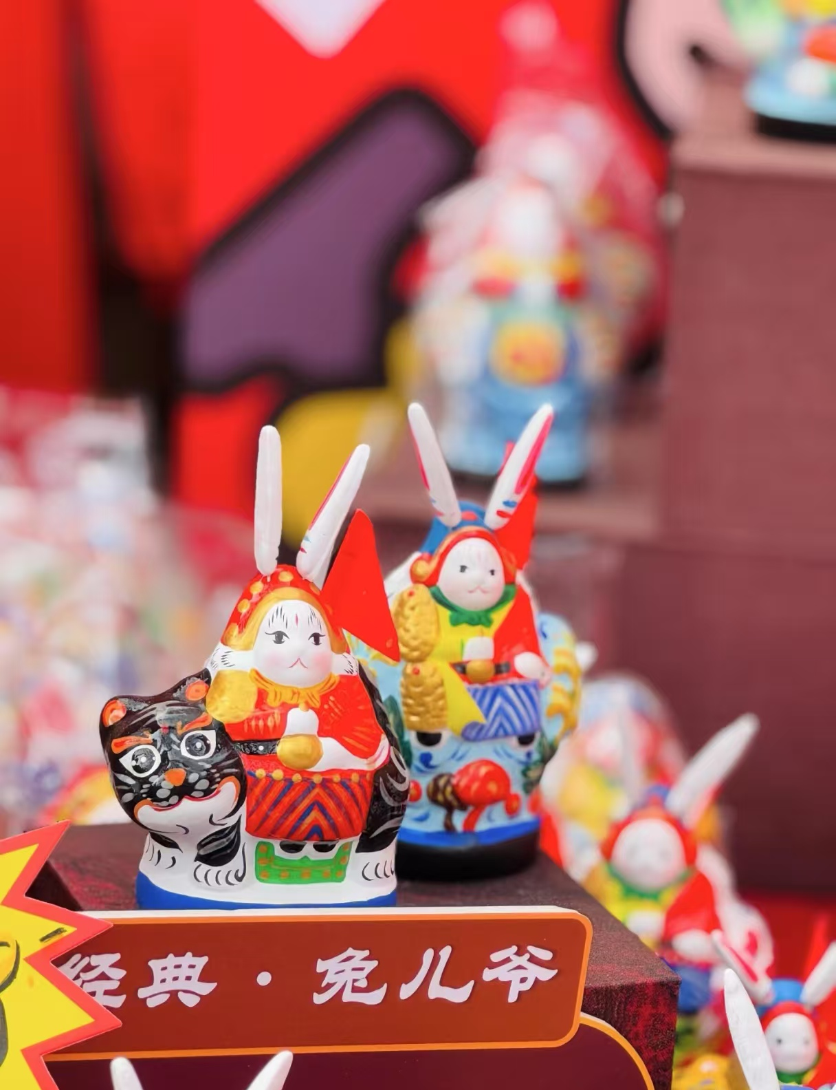 店鋪里擺滿了各式各樣的兔兒爺,濃濃的氛圍感撲面而來,每一個兔兒爺?shù)纳?、形態(tài)各異,特別有趣。據(jù)店鋪老板介紹,關(guān)于兔兒爺,傳說是嫦娥身邊的搗藥小兔子,所以他也寓意著祛病消災(zāi),保佑人們健康平安。