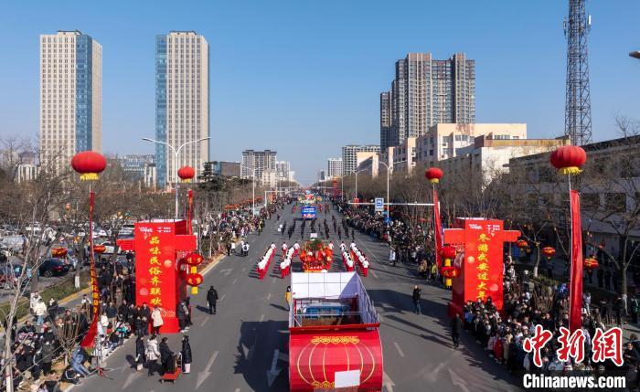 2月9日,位于太行山東麓的河北省武安市舉行了盛大的社火巡演,戰(zhàn)鼓、秧歌、抬閣、跑驢、旱船等極富太行山特色的傳統(tǒng)民俗活動(dòng)輪番登場(chǎng),50支隊(duì)伍逾3000名表演者為市民和游客帶來(lái)一場(chǎng)精彩紛呈的社火狂歡。當(dāng)?shù)厣缁鸨硌菪问蕉鄻?、?nèi)容豐富。每逢佳節(jié),各鄉(xiāng)村爭(zhēng)相上演各類(lèi)社火表演。圖為社火巡游現(xiàn)場(chǎng)的秧歌表演。 李樹(shù)鋒 攝