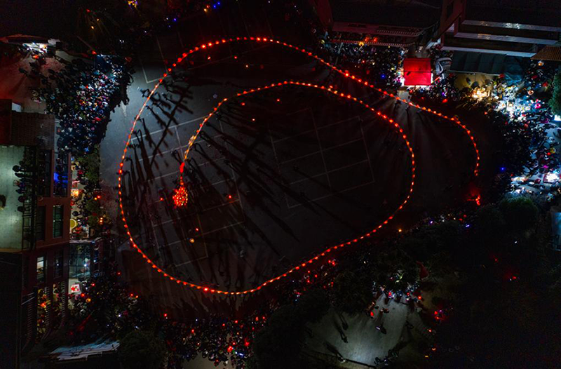 當(dāng)晚6點(diǎn)開(kāi)始,伴隨著熱鬧的鑼鼓聲,陣陣響亮的炮仗聲,一條由100多節(jié)板凳聚合而成的長(zhǎng)龍流光溢彩,格外顯眼。