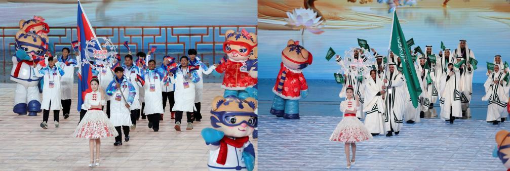 2月7日,第九屆亞洲冬季運動會開幕式在哈爾濱舉行。圖為柬埔寨體育代表團(tuán)(左)和沙特阿拉伯體育代表團(tuán)在開幕式上入場。新華社記者 楊磊 攝