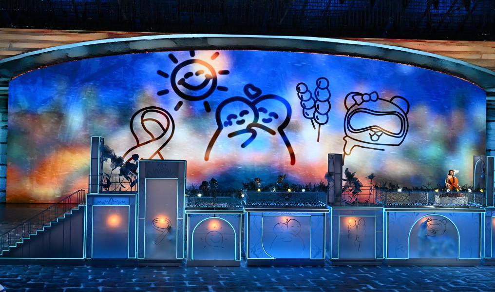 舞臺上,當(dāng)現(xiàn)場舞者與虛擬樂團交相呼應(yīng),閉幕式演出震撼開場。身穿橘黃紗裙的舞者翩然,宛如冰凌花朵朵綻放??蓯鄣摹把┤恕蔽鑴尤珗?,仿佛雪山的精靈帶來捷報。