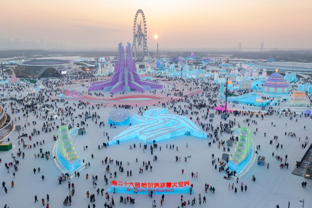 游客在哈爾濱冰雪大世界園區(qū)內(nèi)游玩(無(wú)人機(jī)照片)。新華社記者謝劍飛 攝