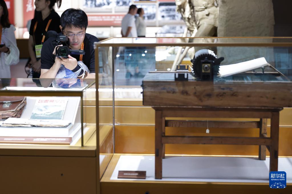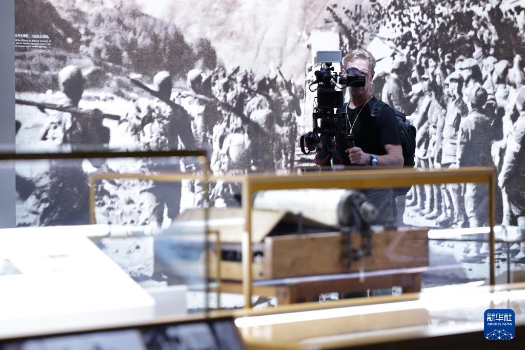 8月27日,中外媒體記者在中國人民抗日戰(zhàn)爭紀(jì)念館內(nèi)采訪。新華社記者 張玉薇 攝