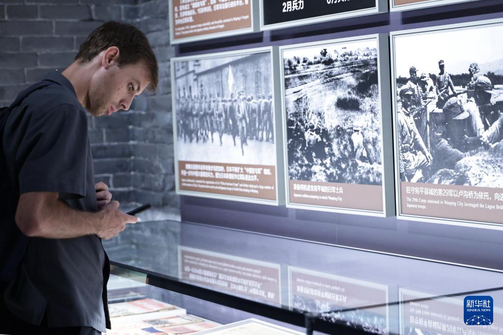 8月27日,一名記者在中國人民抗日戰(zhàn)爭紀(jì)念館內(nèi)采訪。新華社記者 張玉薇 攝