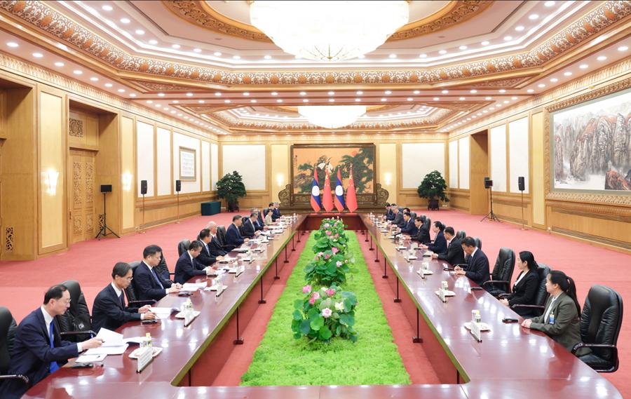 9月4日上午,中共中央總書記、國家主席習(xí)近平在北京人民大會堂會見來華出席2025年上海合作組織峰會和紀(jì)念中國人民抗日戰(zhàn)爭暨世界反法西斯戰(zhàn)爭勝利80周年活動并進行工作訪問的老撾人民革命黨中央總書記、國家主席通倫。新華社記者 丁林 攝
