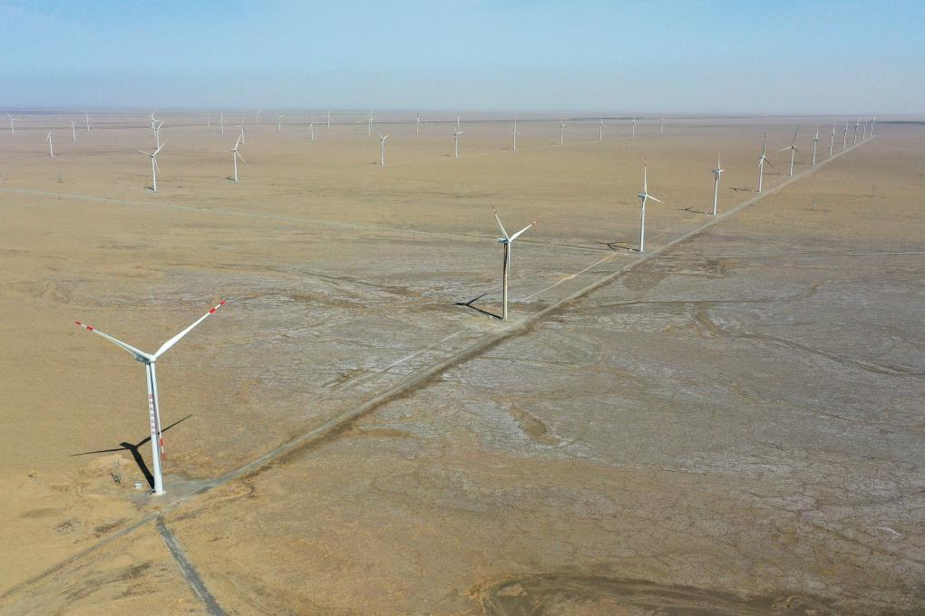 這是在新疆巴音郭楞蒙古自治州若羌縣拍攝的新天綠色能源股份有限公司新天若羌縣羅布莊10萬千瓦風(fēng)電項(xiàng)目(6月27日攝,無人機(jī)照片)。新華社記者 丁磊 攝